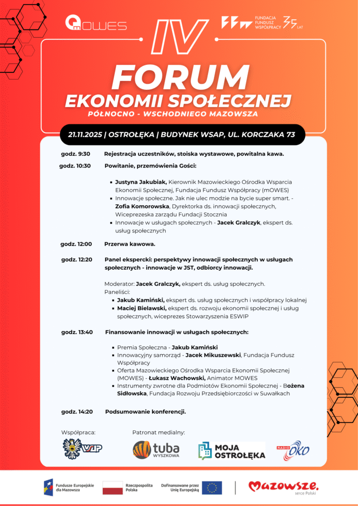 - Wydarzenie będzie także okazją do poznania z bliska działalności wielu lokalnych przedsiębiorców społecznych – Tylko w ostatnich tygodniach sfinalizowaliśmy umowy na przekazanie ostrołęckim przedsiębiorcom społecznym blisko 5,4 mln zł na utworzenie i utrzymanie 77 miejsc pracy. To nie są tylko liczby. To są realne miejsca pracy, realne wsparcie i fundamenty dla rozwoju ekonomii społecznej w regionie” – podkreśla Daniel Prędkopowicz, Prezes Fundacji Fundusz Współpracy.