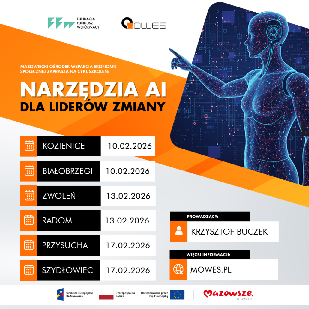 Pracujesz w organizacji pozarządowej lub JST i czujesz, że biurokracja zabiera Ci czas na realne działanie? Dowiedz się, jak oszczędzać zasoby, podnosząc jakość swoich projektów dzięki najnowszym narzędziom sztucznej inteligencji. Przygotowaliśmy dla Ciebie intensywną serię szkoleń w podregionie radomskim, która zmieni Twój sposób pracy z dokumentami, promocją i grantami. Brzmi dobrze? Dołącz do liderów jutra!